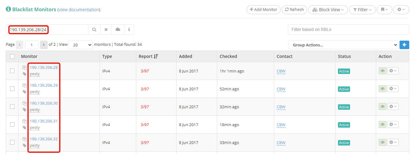 You can easily filter your blacklist monitors per RBL, so only the monitors blacklisted on the selected RBLs will be displayed. This would be very useful when you'll want to start delisting your IPs/domains only from certain blacklists, so you'd want to see only those monitors in your workspace. We also have other filters that can be very helpful, such as: filtering based on recent changes (where you only see the monitors recently blacklisted/delisted); filtering based on monitor type (where you'll see only a certain monitor type, i.e.: IPv4 monitors); or filtering based on whether or not a monitor is blacklisted (so it'll exclude all clean IPs/domains). And, of course, all of the mentioned filters will work very well when combined together, so you can be as precise as possible when it comes to what monitors you'd like to see, for example: view only domains that are blacklisted on the Invaluement blacklist, or view only IPs recently blacklisted/delisted.