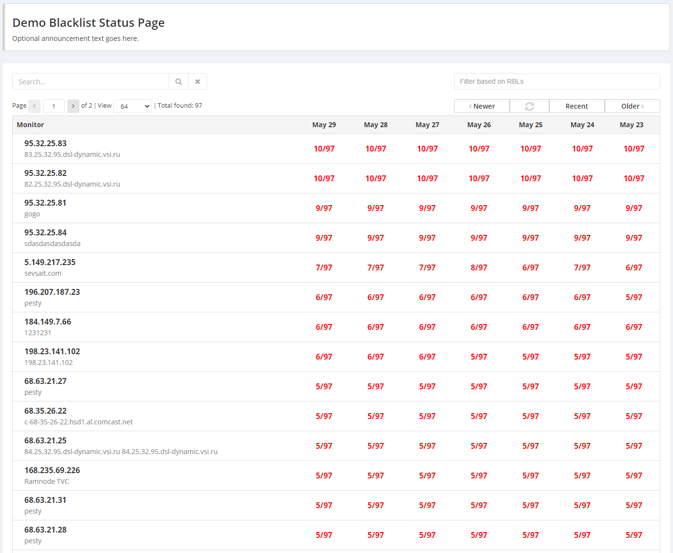You can use our platform's Blacklist Check to instantly check any of your IPs or domain names against all of our monitored RBLs. The check is performed in real-time and you can immediately view its results. Furthermore, every blacklist check will generate its own public blacklist report, which you can share just as you'd do with your own blacklist reports. This feature will help you if you have an immediate need to check an IP or a domain name against our monitored blacklists.