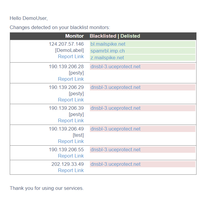 We use it for blacklist monitoring and uptime monitoring. This service has been a big help to us by getting notifications when our servers are down or an IP of ours is on a blacklist.