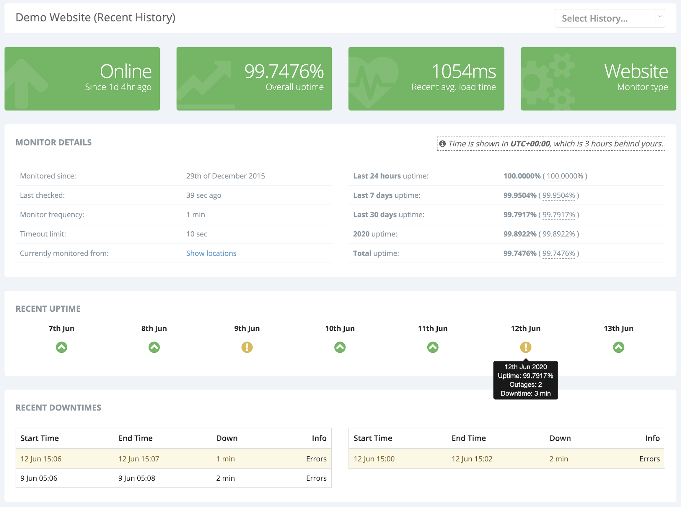 Each one of your Uptime Monitors will have a neatly organised Uptime Report, which will contain all of its history, such as recorded outages, errors, response time, etc. Every Uptime Report is private by default, which means that only you (as a logged in user) can view it, but you can also choose to make it public and share it with your colleagues or clients. We offer an unlimited uptime history in all of our plans, so you don't have to worry about losing your uptime data over the years.