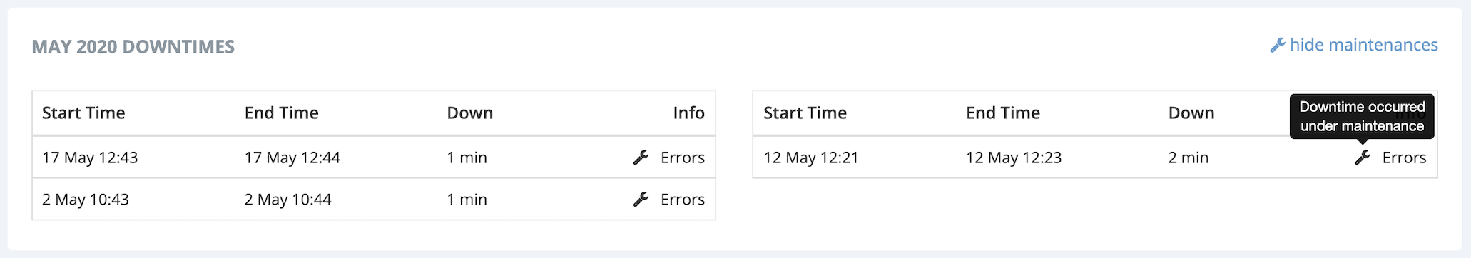 You may have to power off or reboot your servers from time to time, and it's always better to do it as planned rather than unexpected. So we've implemented Maintenance Mode just for such cases, when you need to put your Uptime Monitor on a sort of pause. Unlike most of the other Uptime Monitoring providers out there, our system doesn't pause monitoring under Maintenance Mode, it just marks it differently in your Uptime Reports and optionally pauses alerts sent to you regarding any detected outages. This way, even under maintenance, you can always see whether or not your server or website is up or down. Furthermore, you can even schedule maintenances ahead of time or trigger them via our API from your own system or panel.