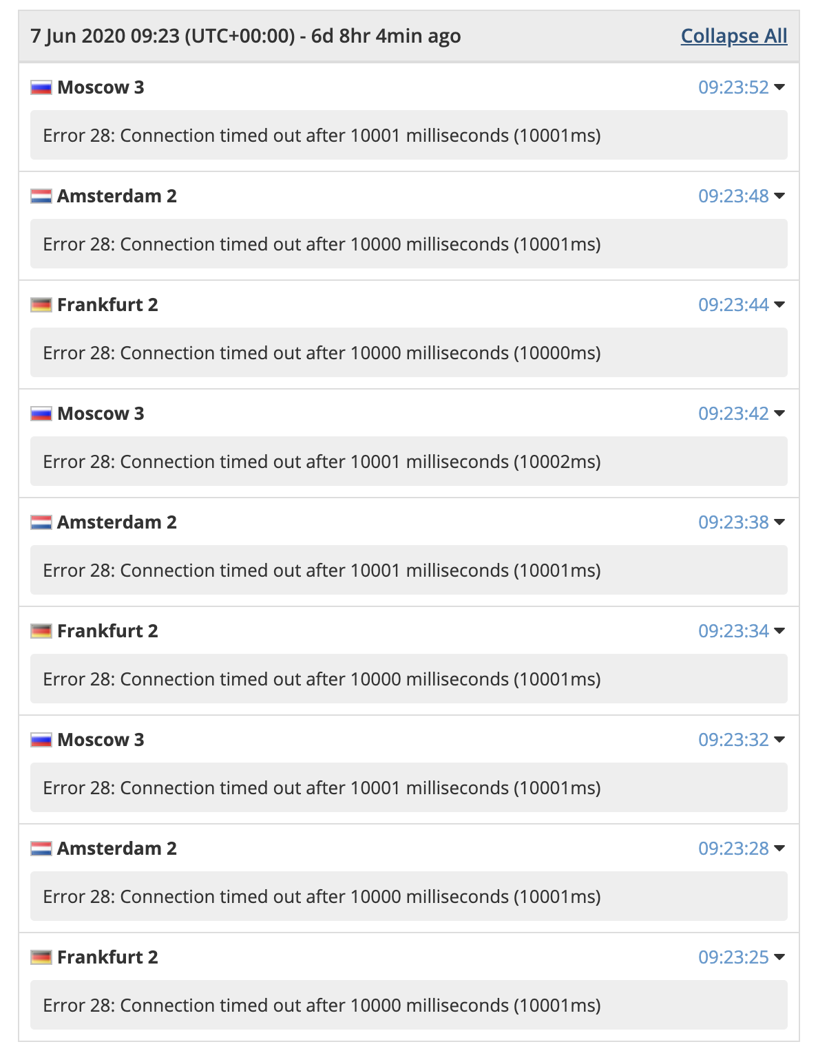 Every time any of our monitoring locations encounters an issue with your website or server, they log the exact error at the exact time it happened, in your Location Fail Log. This is a powerful tool that could help you determine the root cause of any outage, and see how the outage progressed throughout the minute(s).