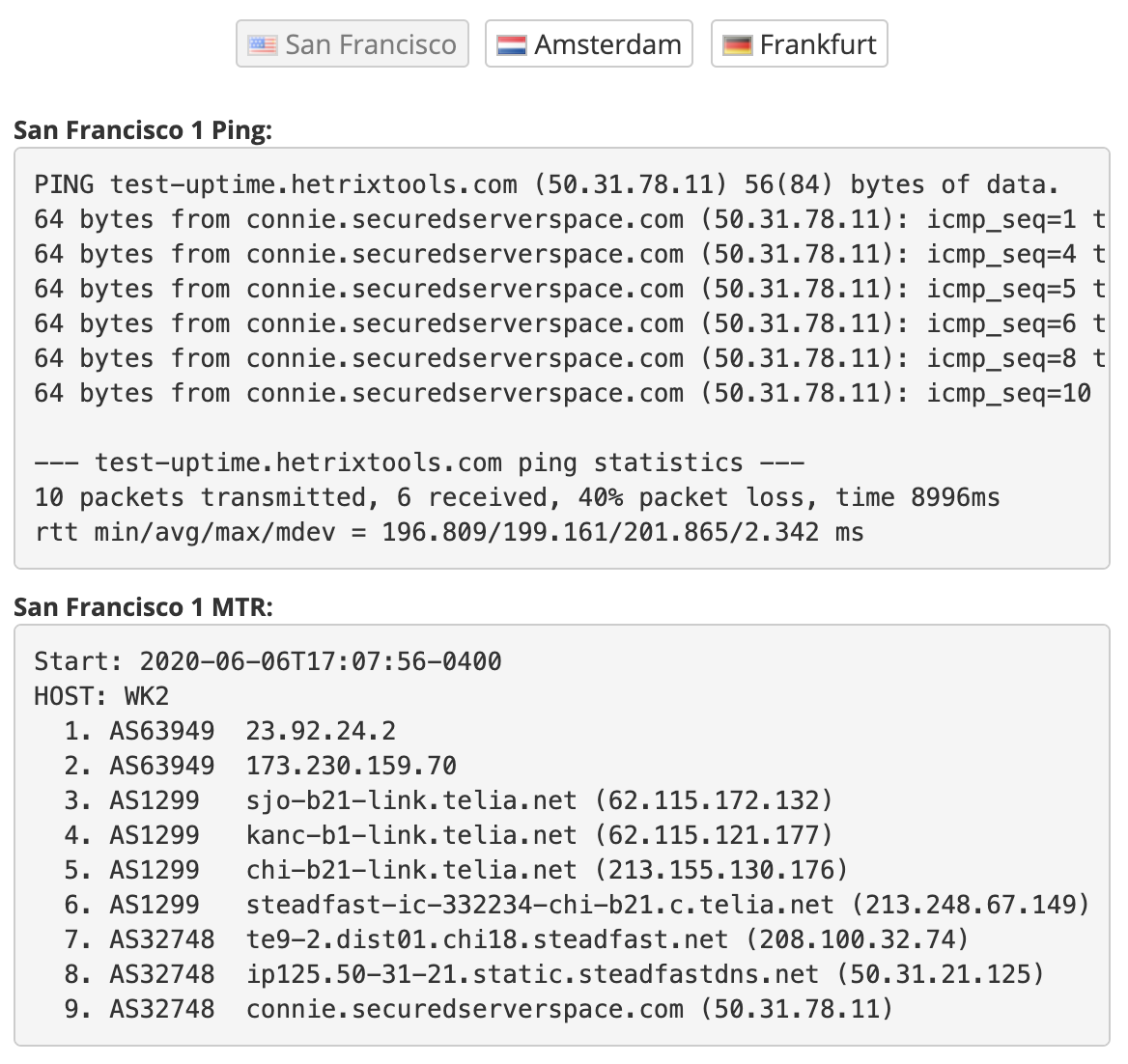 Whenever an outage is detected, our platform immediately dispatches tasks for our monitoring locations to collect MTR and PING samples towards the monitored target, which are then logged in your Network Diagnostics. These are neatly stored in your Uptime Report for you to review and possibly help you figure out what the root cause of the downtime was, if this was a network outage or issue.