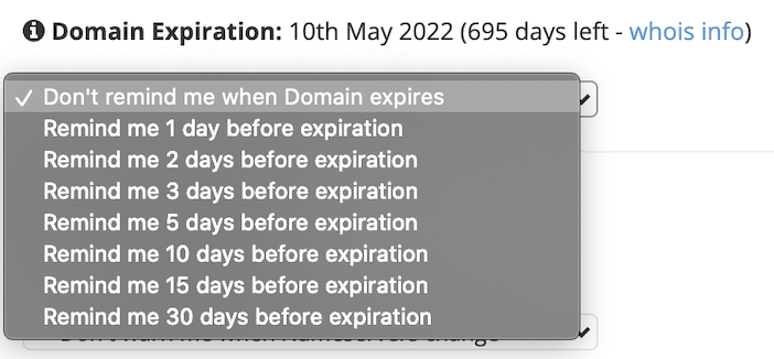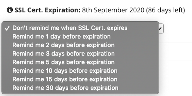 It's always a good idea to monitor all of your domains' expiration dates, to make sure that you're not caught by surprise by one of your websites going down because its domain name has expired. Our platform offers a simple solution for this, monitoring by default all of your Uptime Monitors' domain names. Furthermore, you can even configure alerts to be sent out to you X days before any of your domains are about to expire.