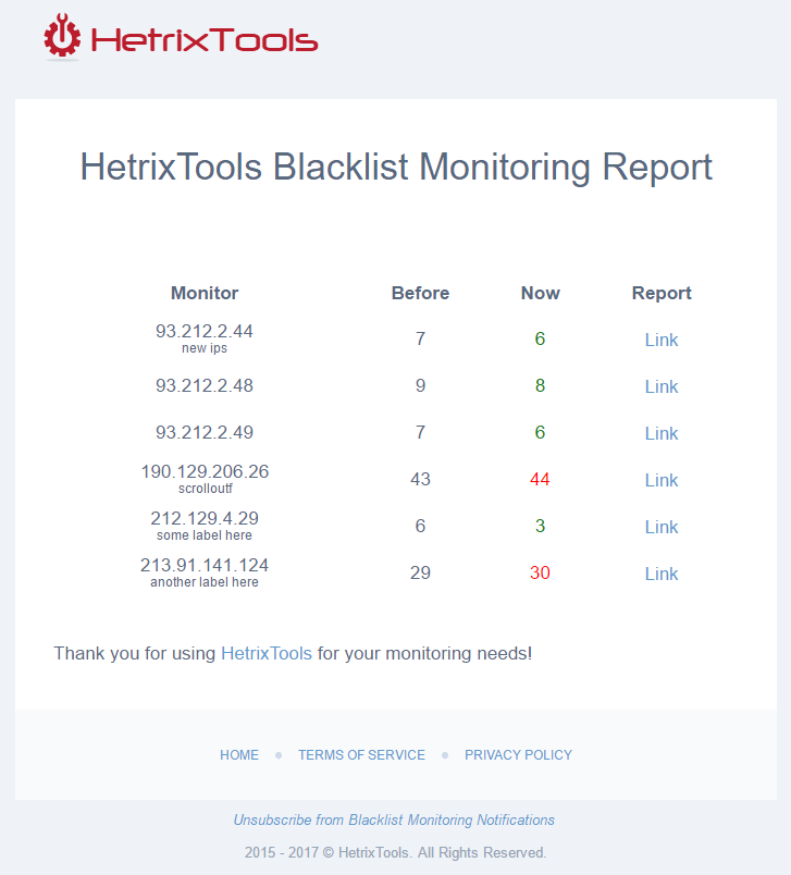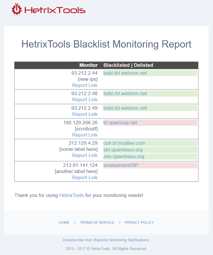 As we are in the hosting industry, sometimes we have clients who abuse our network. We use HetrixTools to monitor our IP's to see if we are on any of the blacklists. HetrixTools does the job, and it does it very well.